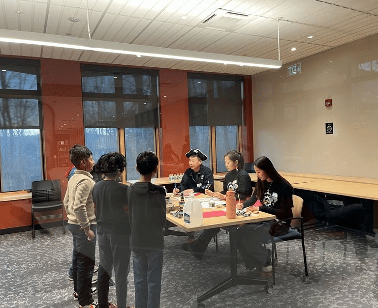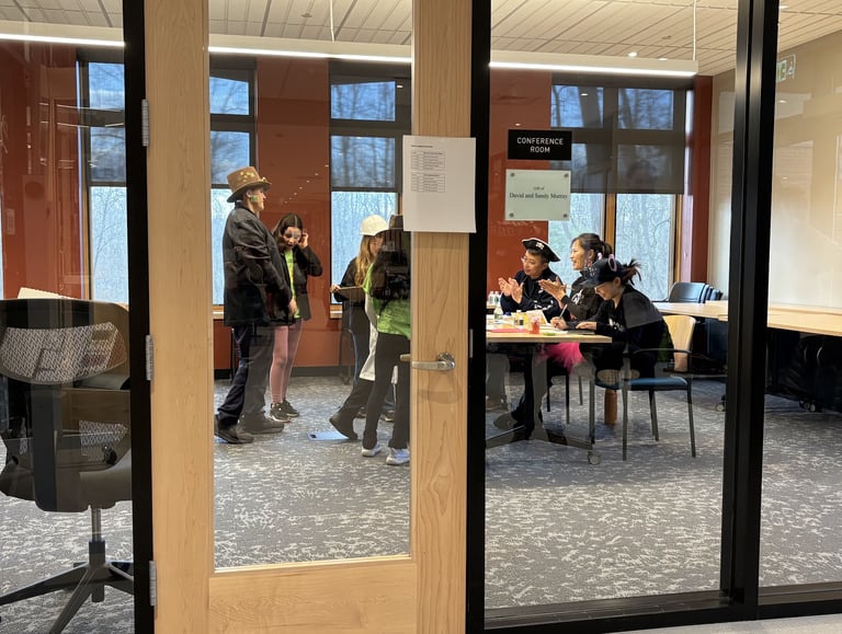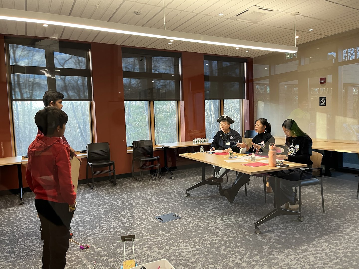 On November 22, we hosted 10 teams for a judging session-only scrimmage in the Reuben Hoar Library! GummyBears Robotics judges dressed up in fun outfits (inspired by judges at FLL competitions) consisting of LEGO earrings and headbands, fun hats, and weird sunglasses! We provided feedback on innovation project and robot design presentations, handed out competition day tips and more practice judging questions, answered all kinds of questions from coaches and parents, and had a robot game table for teams to test their robot on. Teams got to share ideas and tips with one another as well.